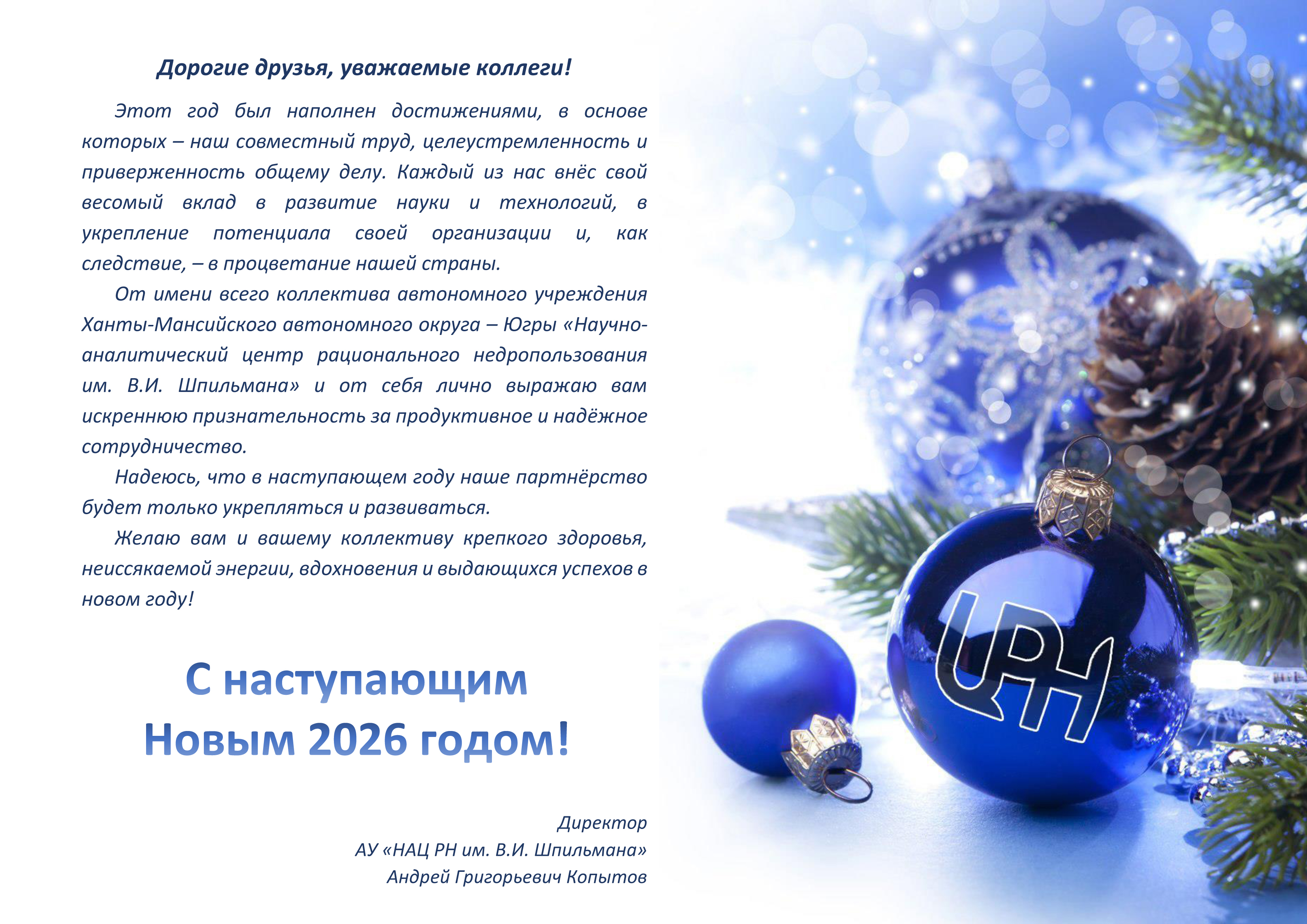 21 ноября 2025 года распоряжением Губернатора Ханты-Мансийского автономного округа – Югры Кухарука Р.Н. на должность директора АУ «Научно-аналитический центр рационального недропользования им. В.И. Шпильмана» сроком на 3 года назначен Копытов Андрей Григорьевич.