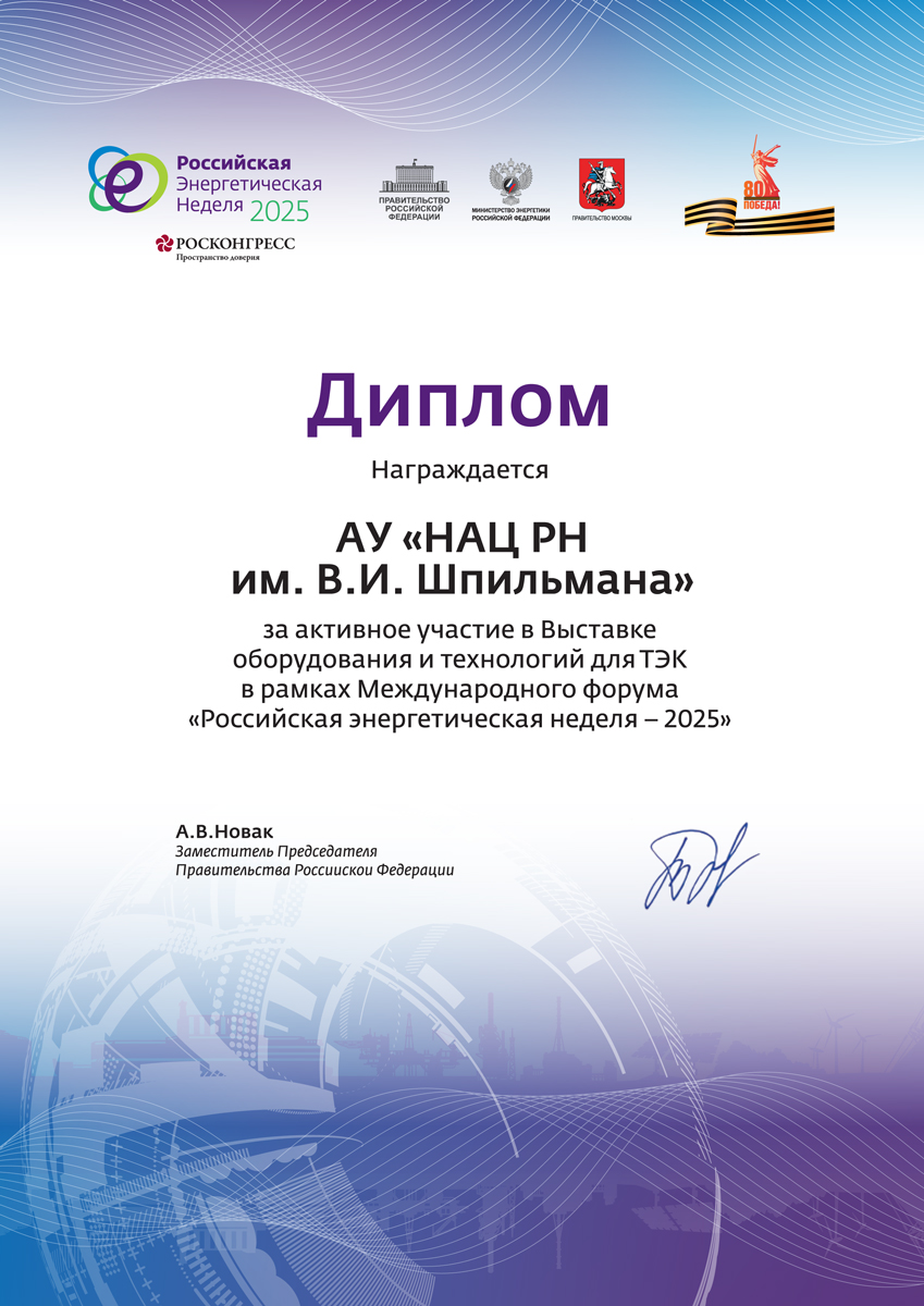 Научно-аналитический центр рационального недропользования им. В. И. Шпильмана награждён дипломом за активное участие в Российской энергетической неделе